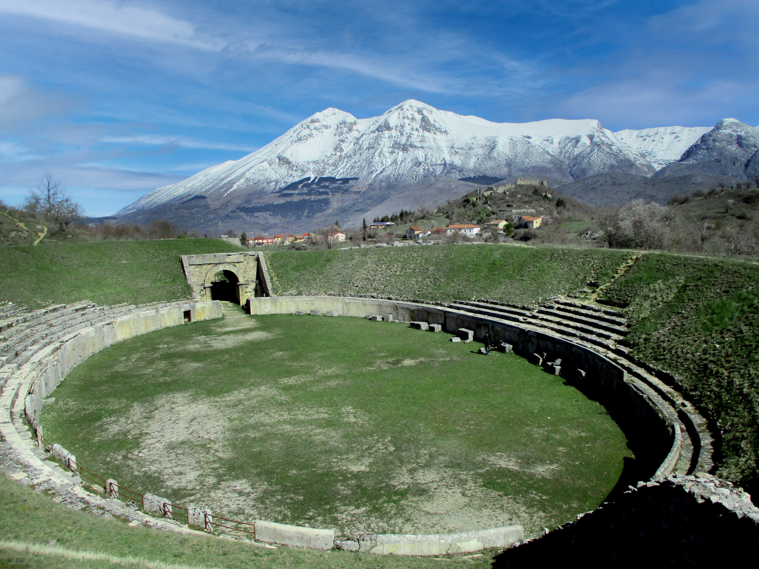 Anfiteatro romano (I sec. D.C.) – La struttura è in parte scavata nella roccia del colle S. Pietro, in parte dotata di mura di forma ellittica. Lo spazio dell’arena equivale a circa la metà dell’Anfiteatro Flavio (Colosseo). Poteva contenere circa 5.000 spettatori. Alle estremità si trovano i due ingressi. Incastonato tra le montagne, il gruppo montuoso del Velino, particolarmente suggestivo al tramonto.